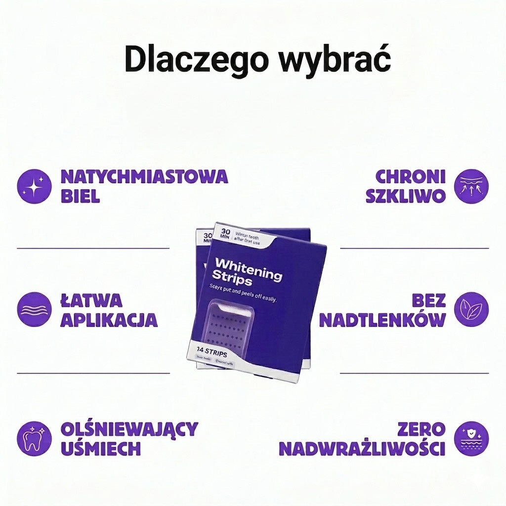 Odkryj fioletowe paski wybielające do zębów. Rewolucyjne rozwiązanie w dziedzinie natychmiastowego wybielania, które zapewnia widoczne efekty już po ich usunięciu.