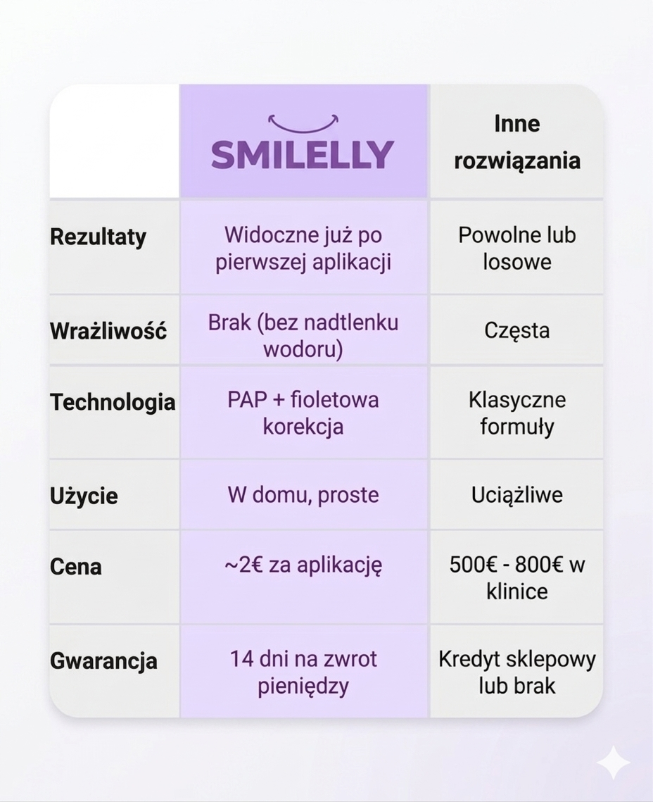 Nasza formuła oparta na PAP wykorzystuje technologię wybielania nowej generacji, która jest łagodniejsza i bardziej inteligentna niż nadtlenek.